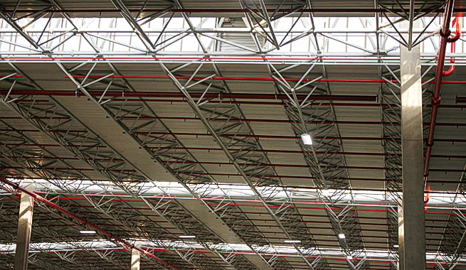 project required 616 tons of steel for its spaceframe structure, consisting of 140 main triangulated tubular trusses and 280 purlin trusses.